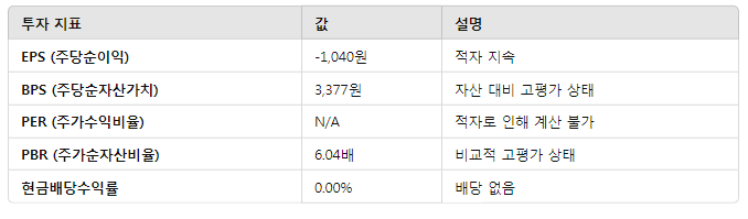- 영업이익 및 순이익 적자 지속 → 재무 안정성 우려