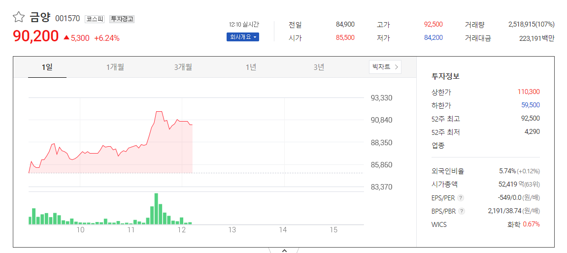 금양의 주가는 84,900원으로 전일 대비 3,800원 (4.6856%) 상승한 것으로 나타났습니다. 이 회사는 올해 상반기에 매출 1,146억원, 영업이익 81억원을 기록했으며 이는 전년 동기 대비 각각 12%, 23% 증가한 수치로 상반기 기준 사상 최대 실적입니다. 최근 금양의 주가는 상승세를 보이고 있습니다. 또한 이차전지, 소재, 수소연료전지 등 다양한 측면의 사업을 시작하므로써 앞으로의 성장성이 기대가 되는 회사입니다.