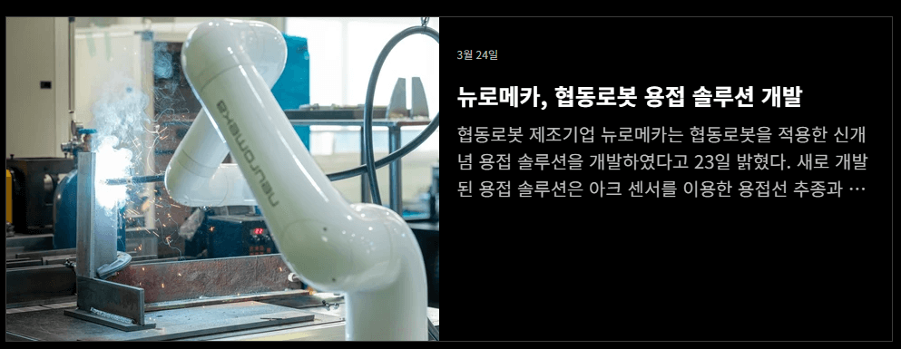 지능형 로봇 제조회사 뉴로메카는 최신 기술을 활용하여 협동 로봇 기반 용접 솔루션을 개발했다고 3월 23일 발표했습니다. 이 새로운 용접 솔루션은 아크 센서를 활용한 용접선 추적과 3D 카메라를 활용한 용접 특이점 자동 추출 기능을 특징으로 합니다. 이 협동 로봇은 충돌 위험이 있는 상황에서 자동으로 정지되는 안전장치가 탑재되어 있어, 작업자와 함께 작업하기에 안전합니다. 또한 직관적인 인터페이스와 쉬운 프로그래밍으로 누구나 쉽게 로봇을 조작할 수 있습니다.