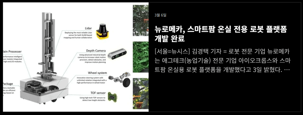 뉴로메카는 선진적인 산업용 로봇 분야 기술로 인해 글로벌 사업 확장을 이루고 있는 기업입니다. 특히 회사들의 로봇 사업 강화 추세로 인해 로봇 관련 주식들은 현재 큰 관심을 받고 있습니다. 뉴로메카를 비롯하여 에스피시스템스, 인탑스, 에스비비테크, 로보스타, 큐렉소, 티로보틱스, 현대 무벡스, 레셀, 아직엑스텍 등이 관련주로 떠오르고 있습니다.