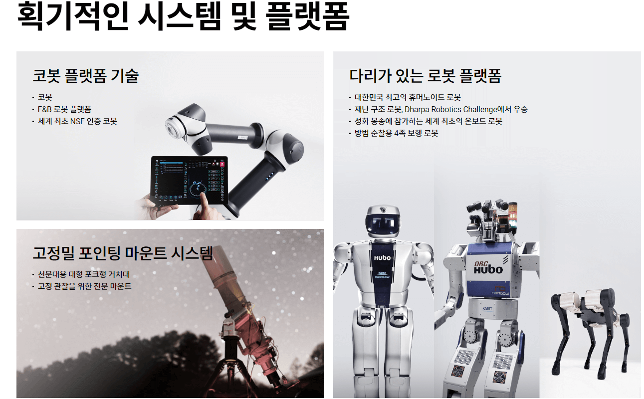 레인보우 로보틱스는 RB 시리즈, DRC 휴보, FX-2, JAY 등 다양한 로봇시리즈를 가지고 있으며, 앞으로의 성장이 기대 되는 회사입니다.