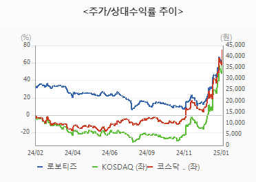 최근 로봇 산업의 급성장과 AI 기술 발전에 힘입어 주가는 상승세를 보였지만, 단기 조정으로 인해 52주 최고가(45,000원) 대비 다소 하락한 상태입니다.