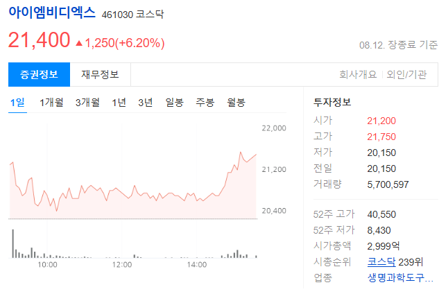 아이엠비디엑스의주가는최근긍정적인흐름을보이고있습니다.2024년8월5일기준으로주가는약10.41달러였으며,이는52주최저가인6.09달러에서크게상승한수치입니다.