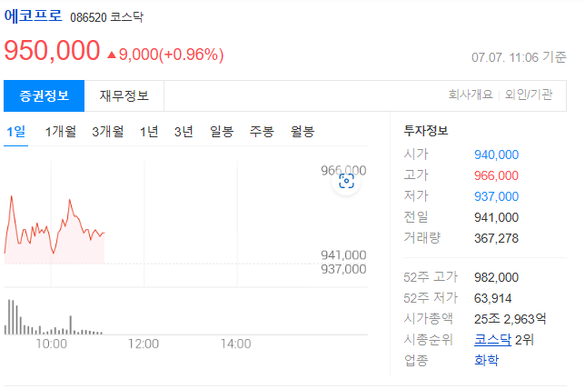 에코프로는 이차전지 양극재를 생산하는 기업으로, 코스닥 시가총액 3위에 해당합니다.