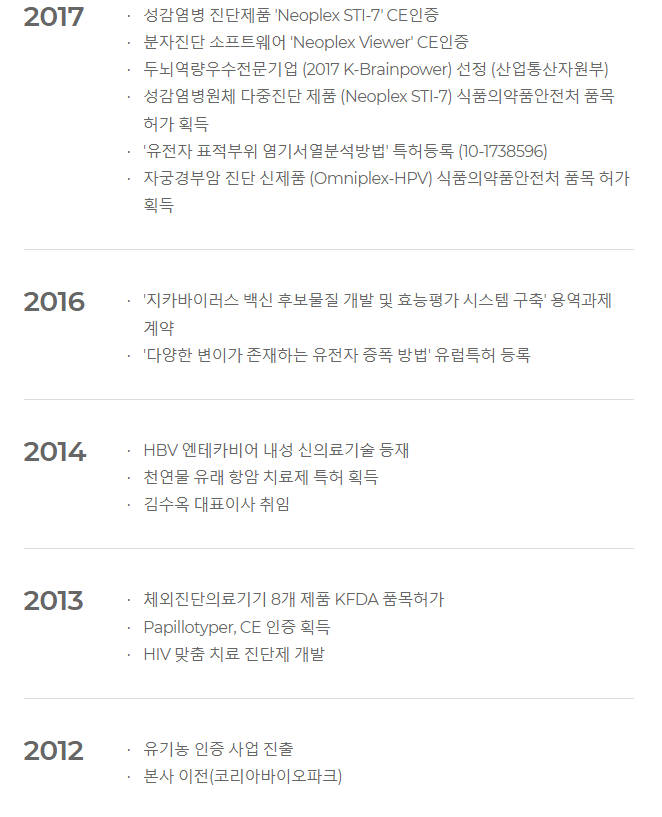 인천시에 본사를 둔 이 회사는 2000년 창립되어, 자체 개발한 분자 진단 원천 기술을 바탕으로 질병 대량 진단을 가능케 하는 의료기기를 개발하고 판매하고 있습니다. 이 회사는 코스닥 시장에서 상장되어 있으며, 분자 진단 사업부문과 체외 진단 사업부문으로 나뉘어져 있습니다. NeoPlex STI, OmniPlex-HPV, 생화학 및 래피드 등의 제품과 의료 장비, 그리고 LUCICA GA 등의 상품을 보유하고 있습니다. 이 회사는 현재 연결 대상 종속법인이 없습니다.