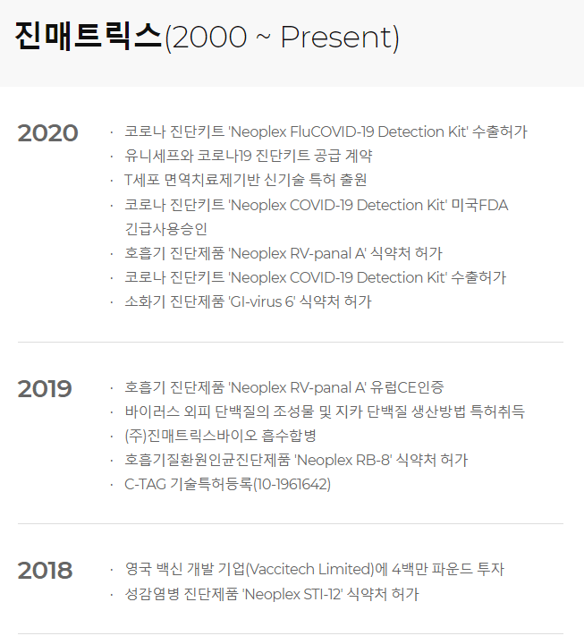 체외 진단키트 매출은 당분간 계속될 것이나 제한적일 것으로 예상되며, 지카 감염, A형 감염 예방을 위한 백신 및 Neoplex MPX 등을 개발 중이라고 합니다.