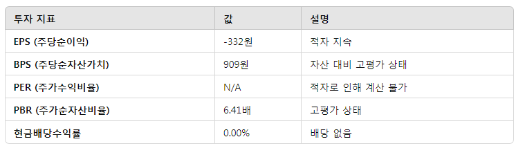 - PER N/A → 적자 지속이지만 순이익 흑자전환(5.75억 원)으로 개선 가능성