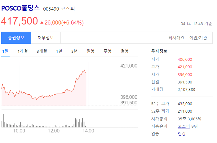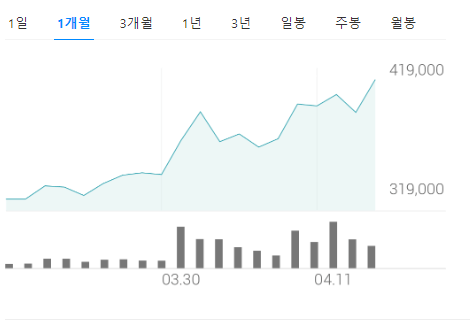 현재 시총 35조 3000억원으로 코스피 시총 9위입니다.(2023년 4월 14일 기준) 52주 고가433,000원 이며, 52주 저가211,000원 입니다.