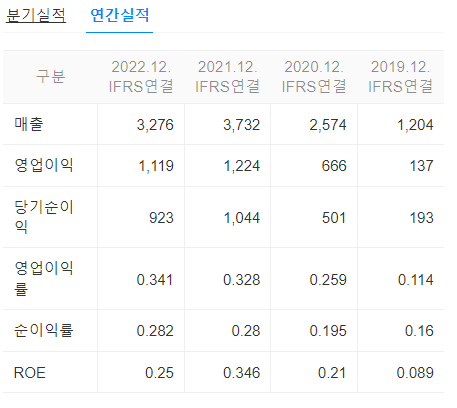 지난해 2022년, 반도체 전방산업의 투자 위축과 중국 고객사향 장비 공급 지연으로 인해 매출액은 전기 대비 12.2% 감소한 3,276억 원이었으며, 영업이익은 1,119억 원으로 8.6% 감소했습니다. 또한 당기순이익 역시 전기 대비 11.7% 감소한 923억 원의 실적을 기록했습니다. 이로 인해 전반적으로 실적 감소세를 보이게 되었습니다.